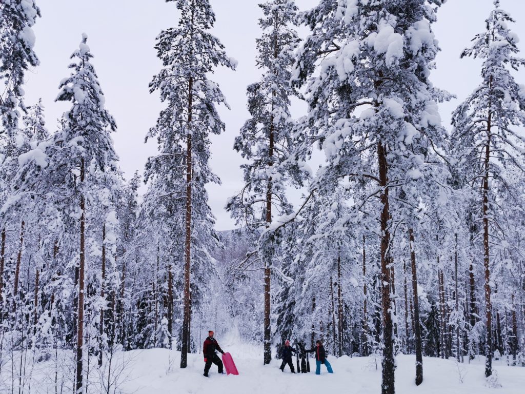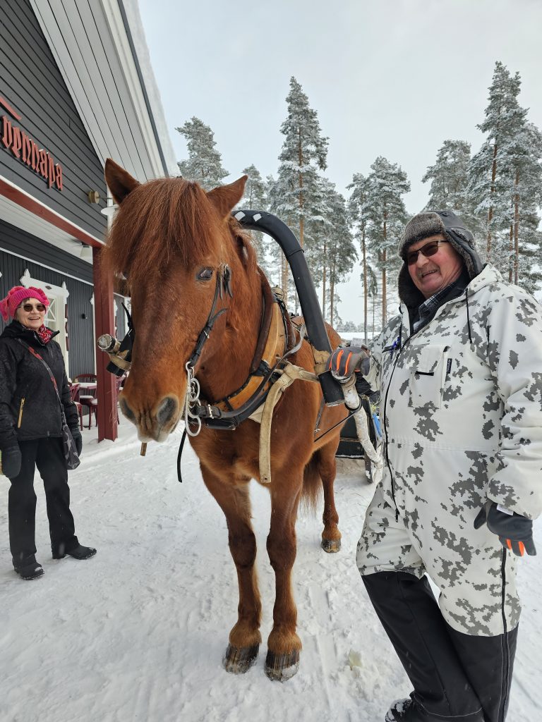 Jouluinen rekiajelu Suomen hevosella ja mäen laskua tai reippailua lumisessa puutarhassamme ja jäällä.